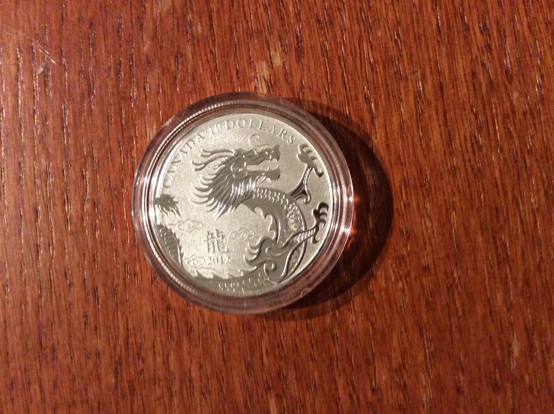 華人愛吉祥物。有一個幣, 有松、龜、鶴, 都是壽徵。另一個幣,則有貔貅。"貔貅,古代的一种瑞獸,中国古代風水學者認為貔貅是轉禍為祥的吉瑞之獸。 從古至今,上至帝王、下至百姓都注重收藏和佩戴貔貅,傳說貔貅除了開運,闢邪的功效之外,還有鎮宅、化太歲、促姻缘等作用。"(《维基百科》: 貔貅)。這個 “風水好運符” (Feng Shui Lucky Charm) 便由此應運而生 (圖七、圖八)。這個銀幣, 中間如通寶方孔, 幣值只有八元, 售價 $98.88。反面(reverse side)有貔貅以外,加上葫蘆。正面(obverse side)有英女皇頭像, 加上葫蘆和吉祥繩結, 設計不錯。近期也發行了一個吉祥幣, 也是方孔,反面是太極符在上, 孔兩旁分別有虎和龍, 正面在孔之上是英女皇頭像, 孔兩旁是雙鳳, 鳳的頭尾都帶祥雲 (圖九、圖十)。這幾個銀幣, 捕捉華人深慕吉祥的心理, 但在設計上都有架床疊屋的感覺。華人自詡為龍的傳人。以龍做主題的硬幣, 正確數目我不知道, 總有一打吧。除龍年幣以外,龍舟節的龍頭幣, 加紅藍色, 很有神采。舞龍也有龍頭幣, 其他或平或貴的, 可供選擇 (見圖十三2012龍年$10硬幣)。